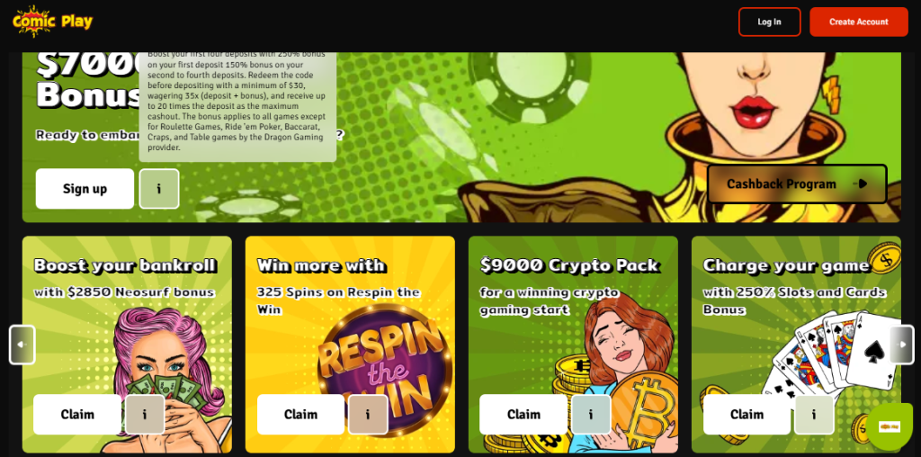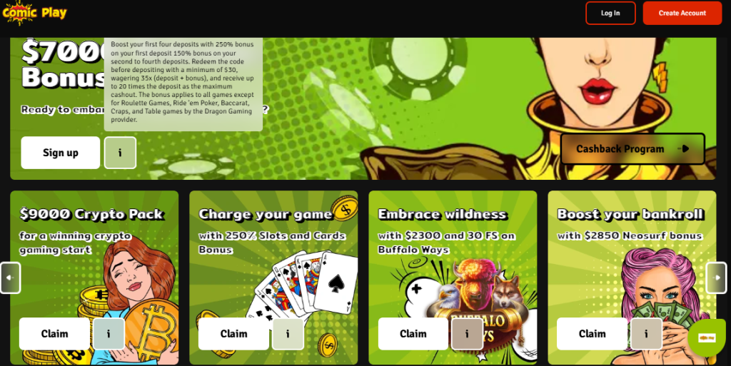 - Access to a wide range of games: While some offers may be restricted to specific games, many allow players to choose from a wide variety of options within Comic Play Casino.